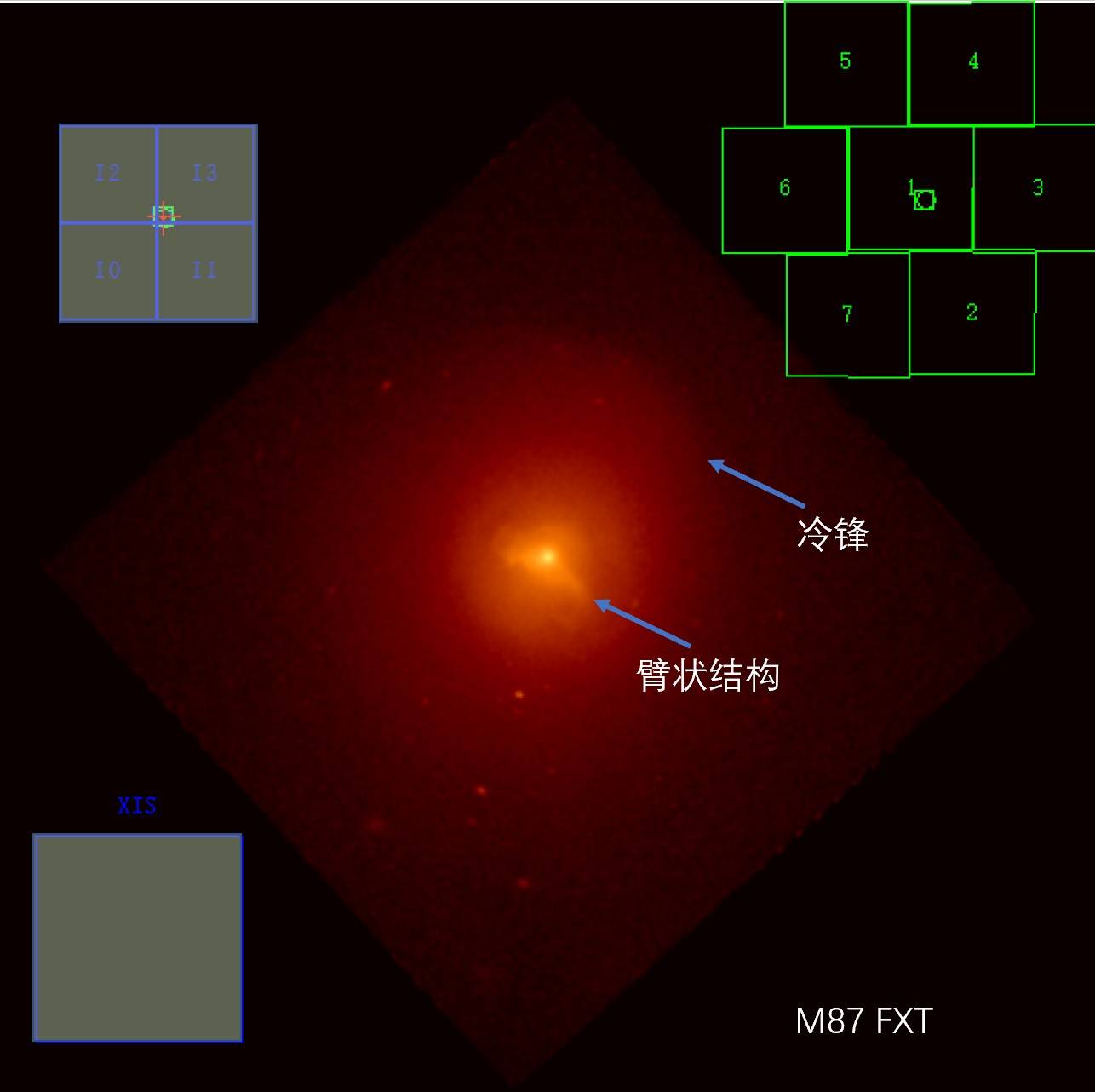 M87是室女座星系团(Virgo星系团)中的明亮的巨椭圆星系。图3FXT采用全帧科学观测模式直接获得的M87图像,能段为0.3~10 keV,曝光时间为39 ks。不同于光学图像,在X射线能段,FXT观测到M87内存在大量弥散的热气体。M87的中心亮斑来自于星系中心活动星系核(AGN)的辐射,向外还伸出了两个臂状结构,这是由于AGN活动所产生的射电气体喷流把冷气体裹挟出来,冷气体密度大,而使辐射增强,最终形成了明亮的臂状结构。此外,在M87外围,还清楚地观测到表面亮度发生阶跃变化,形成“冷锋”。在图3中还放置了国际上主要Wolter-IX射线望远镜的视场示意图,左上为美国Chandra望远镜视场范围,左下为日本Suzaku望远镜视场范围,右上为欧洲的XMM-Newton望远镜视场范围。与这些望远镜相比,FXT的视场是一个完整的整体,没有用多个CCD进行拼接,因而视场内没有缝隙;此外,FXT的视场要大很多,对M87外围的“冷锋”结构一览无余,甚至还可以看到更外围来自于室女座星系团气体的X射线辐射。