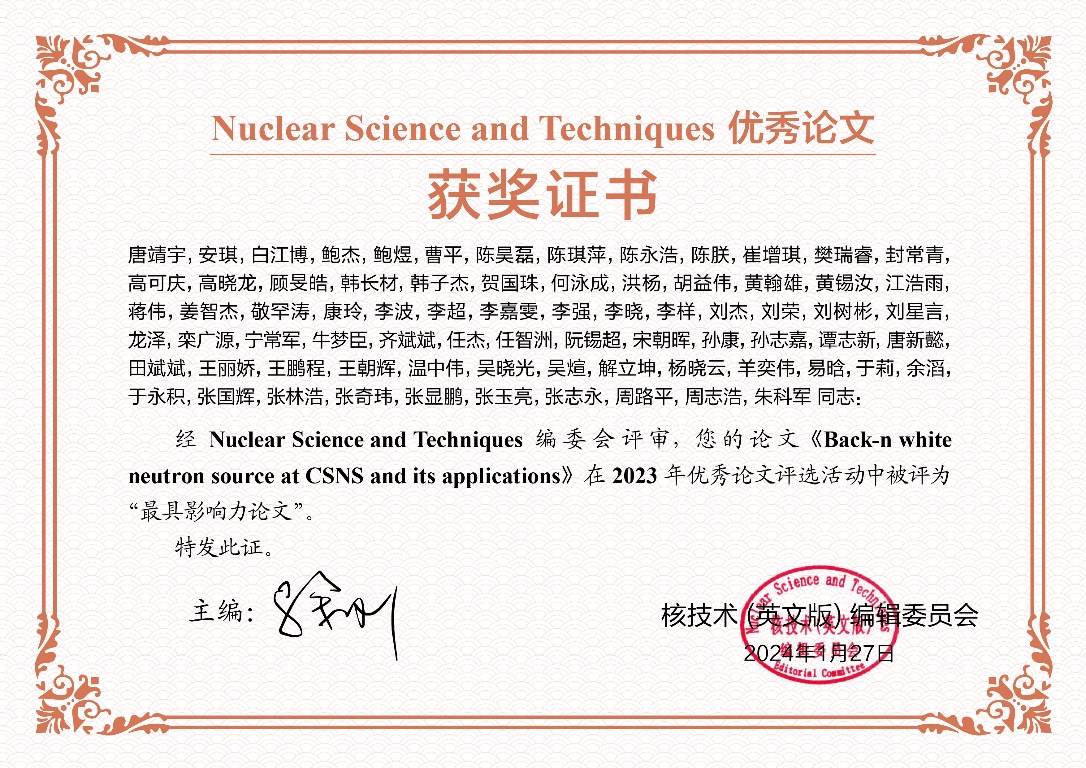 近日,关于中国散裂中子源(CSNS)反角白光中子实验装置(Back-n)的综述论文“Back-n white neutron source at CSNS and its applications”获评《Nuclear Science and Techniques》(NST)期刊2023年“最具影响力论文”。本论文是发表在NST 2021年第1期的主编约稿论文,综述了CSNS Back-n的束线建设、束流特征、探测器谱仪等实验条件,介绍了装置运行3年来在核数据测量、探测器标定、单粒子效应、中子成像和元素分析等方面的应用和取得的一批重要成果。