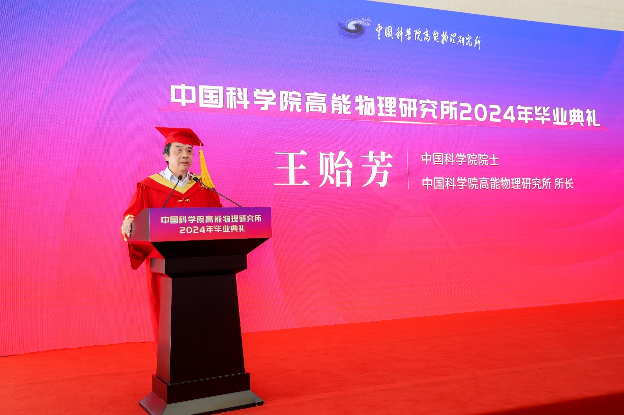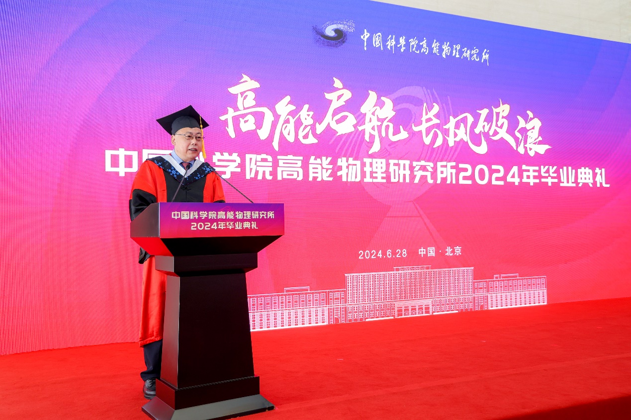 王贻芳首先代表高能所向顺利完成学业的毕业生表示祝贺,向毕业生的导师和亲友表示感谢。他回顾了高能所的历史和老一辈科学家的卓越贡献,强调这些成就和精神是高能所的宝贵财富和前进动力。随后,他与毕业生分享了四个关键词:探索未知、创新引领、求真务实和科学报国,希望同学们在未来的科研道路上保持探索的热情、创新的精神、严谨的态度和报国的情怀。最后,他祝愿毕业生和高能所在未来不断创造新的辉煌。
