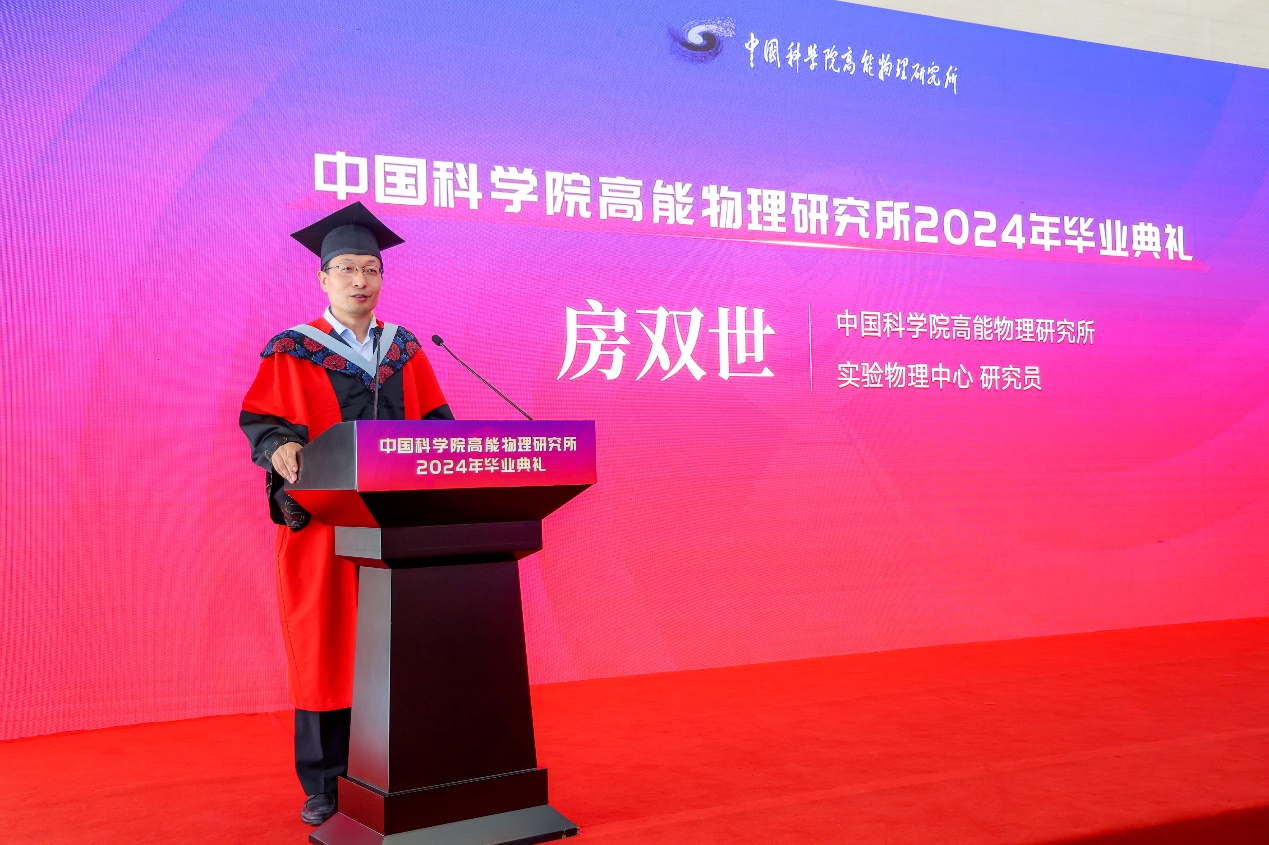 房双世老师作为导师代表发言,他简述了近年来高能所在江门中微子、LHAASO、散裂中子源、高能同步辐射光源等大科学装置以及前沿科研项目中取得的重大研究成果,对同学们做出的贡献表示肯定。他指出,毕业典礼是同学们迈向未来新征程的起点,希望同学们继续践行不懈努力、脚踏实地的实干精神,不畏前路艰险,在各自的工作领域绽放光彩,成就卓越,肩负起推动国家科技进步的重任。