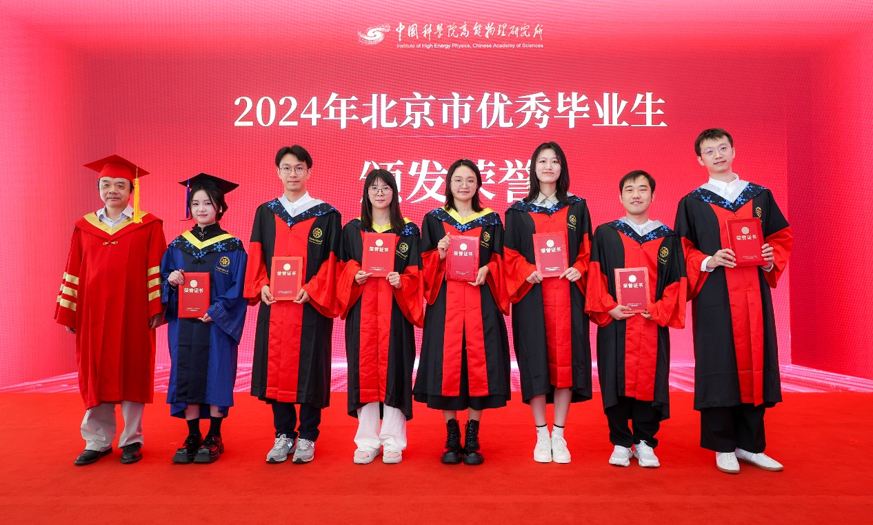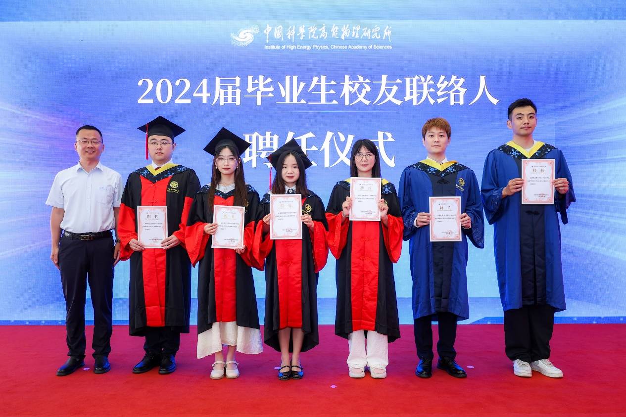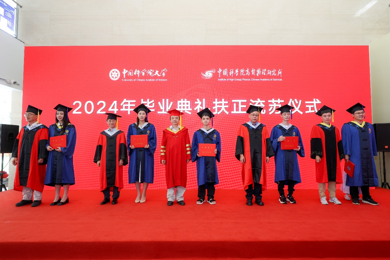 典礼上,王贻芳为院长奖获得者代表和优秀毕业生代表颁发荣誉证书,纪委书记李伟为2024届校友联络人颁发聘书。随后,所领导为毕业生颁发毕业证书,扶正流苏。魏龙以“科技兴则民族兴,科技强则国家强”来激励毕业生,希望毕业生在未来的道路上继续发扬高能所的优良传统,保持对科学的热爱和追求,勇攀科技高峰,为国家的科技进步和民族复兴贡献自己的力量!