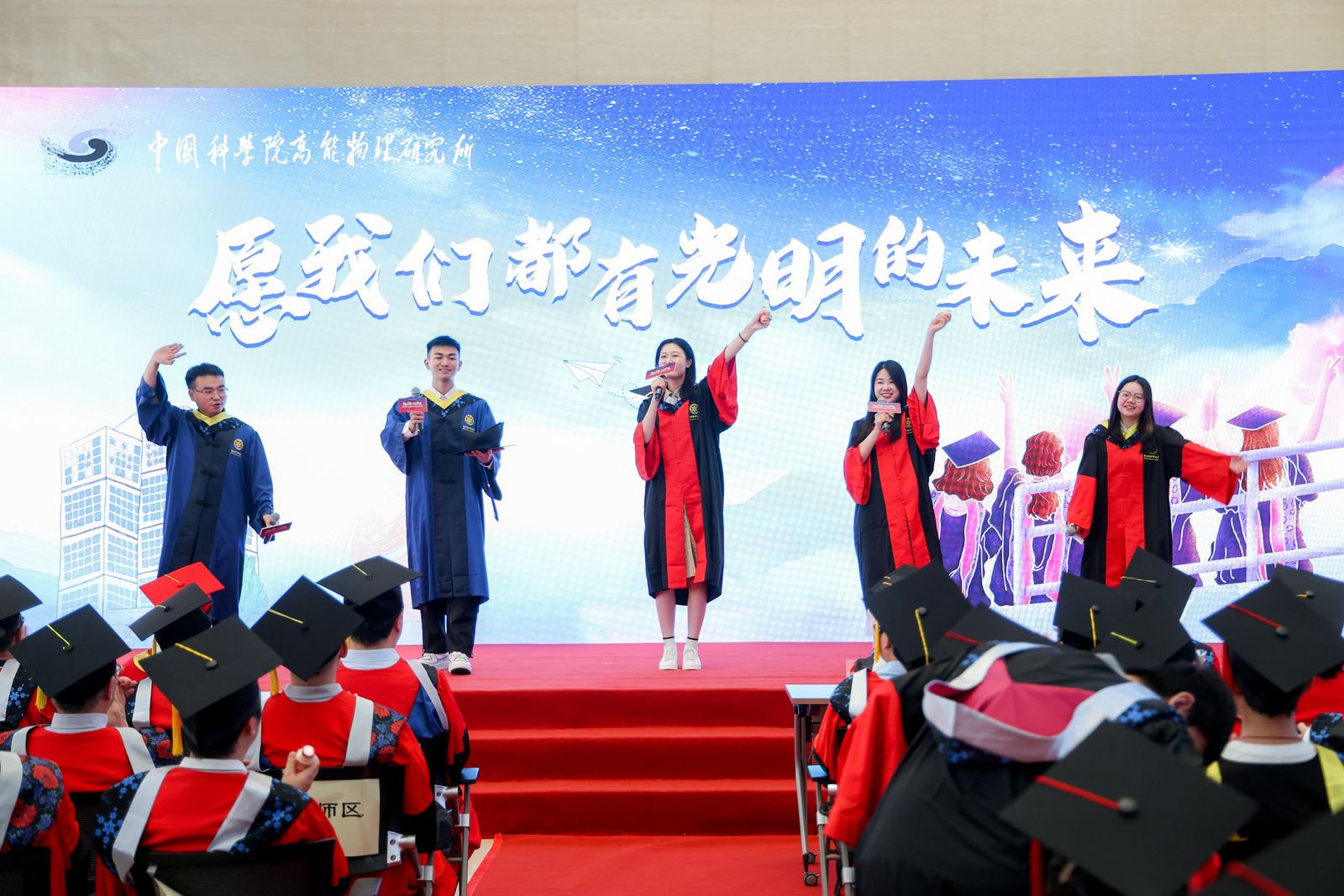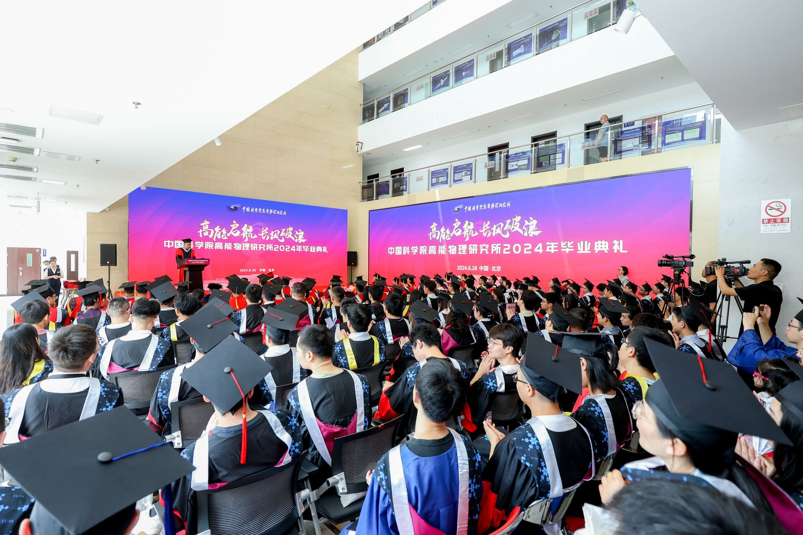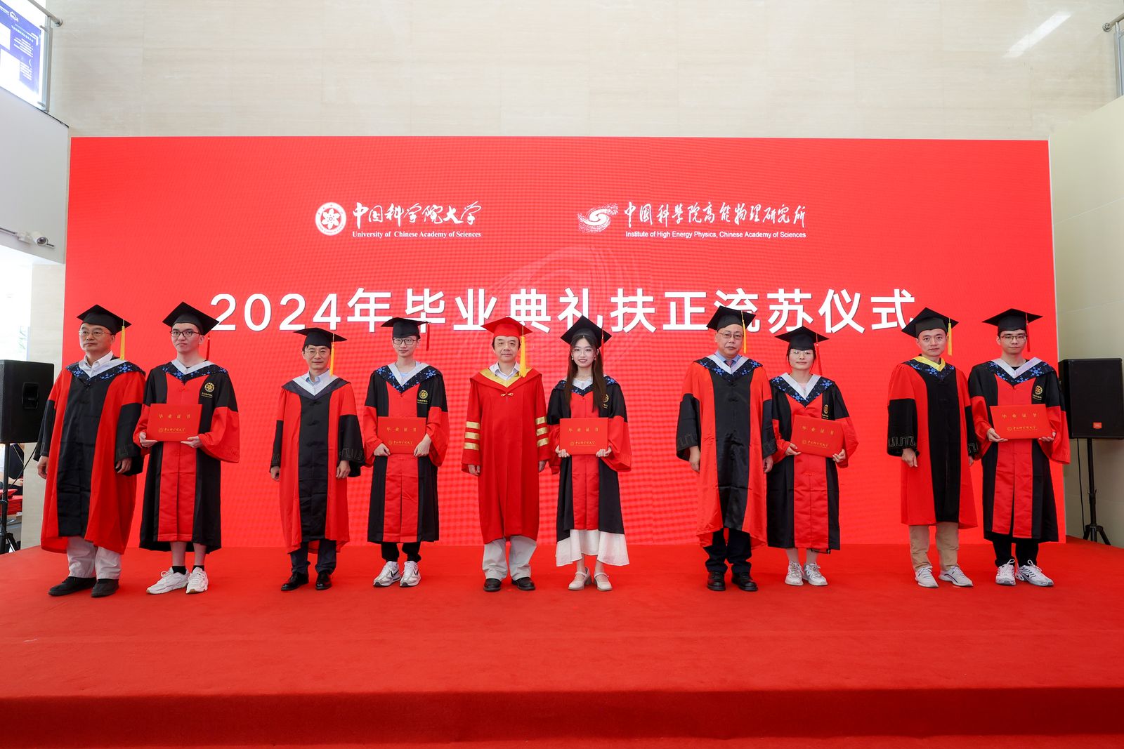 典礼上,王贻芳为院长奖获得者代表和优秀毕业生代表颁发荣誉证书,纪委书记李伟为2024届校友联络人颁发聘书。随后,所领导为毕业生颁发毕业证书,扶正流苏。魏龙以“科技兴则民族兴,科技强则国家强”来激励毕业生,希望毕业生在未来的道路上继续发扬高能所的优良传统,保持对科学的热爱和追求,勇攀科技高峰,为国家的科技进步和民族复兴贡献自己的力量!