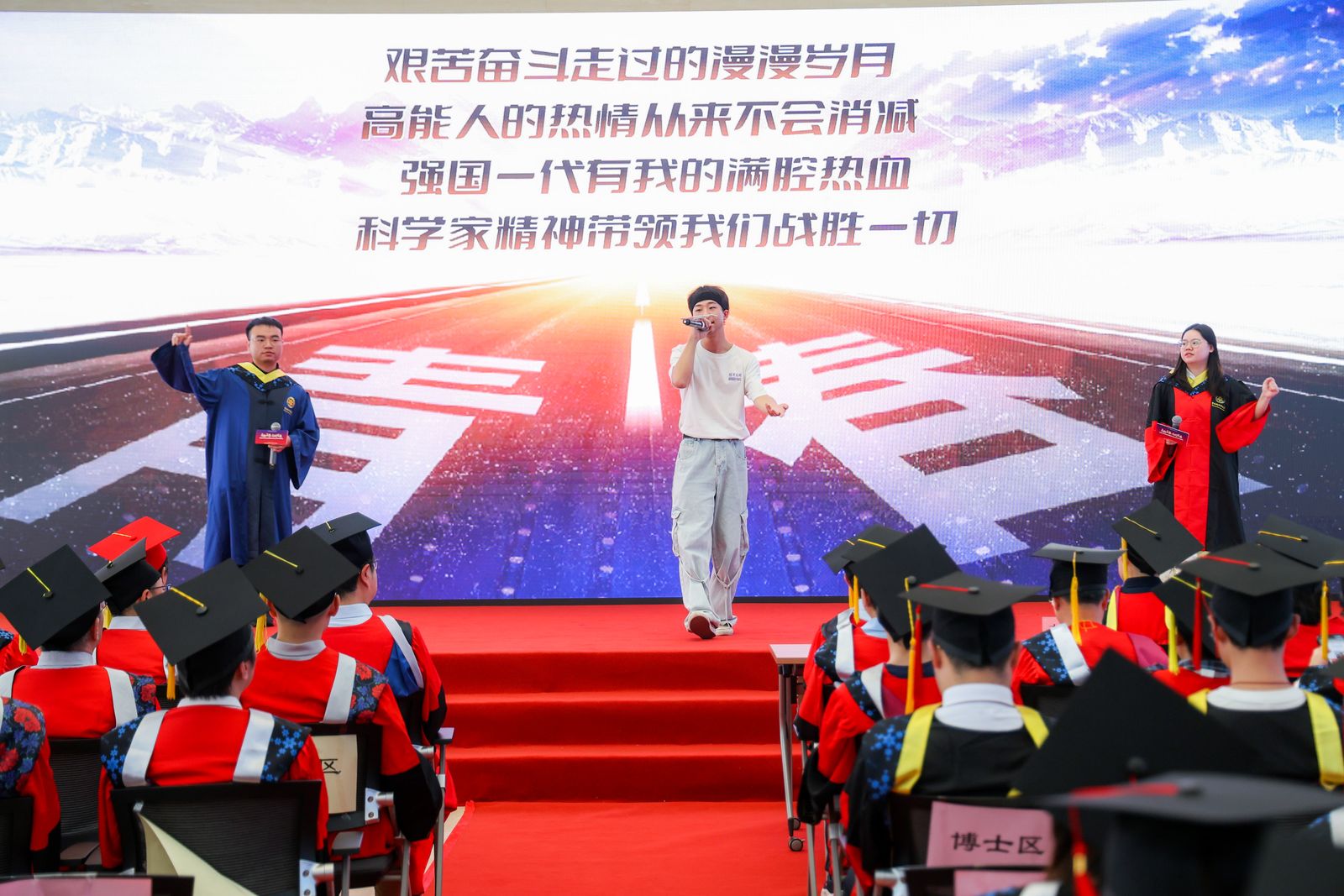 毕业典礼在《凤凰花开的路口》、《高能启航》和《干杯》的合唱中落下帷幕。