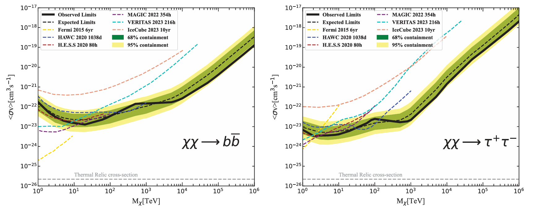 图:LHAASO的观测结果排除了黑线以上的暗物质湮灭反应截面,换句话说,如果暗物质存在的话,其湮灭的几率一定要小于黑线所对应的数值。横坐标代表暗物质质量,纵坐标代表暗物质湮灭产生伽马射线的反应截面,也就是湮灭的几率。不同颜色的虚线是其他实验给出的限制,可见LHAASO在约10TeV以上的高质量区给出了最强烈的限制。左图和右图分别给出了两个代表性的暗物质粒子的湮灭的反应过程的分析结果。