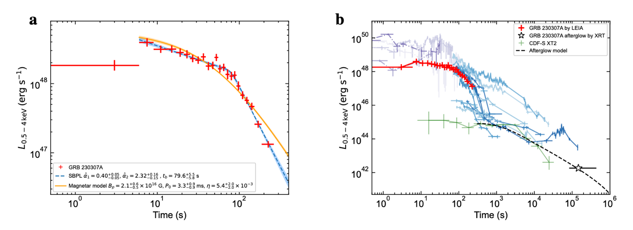 图 1GRB 230307A的X射线光变曲线以及磁陀星作为中心引擎的模型拟合,引自已发表论文。