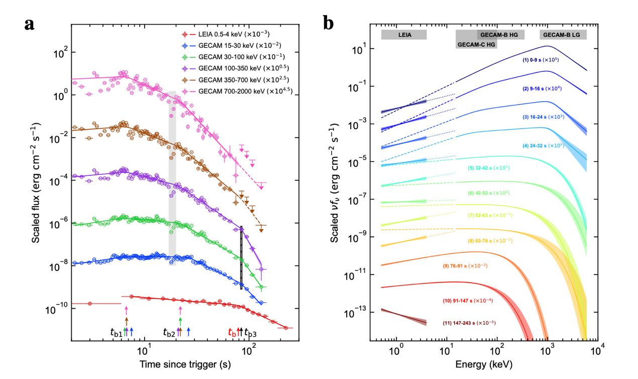 近日,来自中国科学院国家天文台、快盈v3、南京大学、中国科学院紫金山天文台以及美国内华达大学等多家科研机构的研究人员组成的合作团队,通过分析天关卫星探路者LEIA和“怀柔一号”极目卫星联合获得的从X射线到伽马射线宽波段(500电子伏至6百万电子伏)数据,发现迄今第二亮伽马暴(编号为GRB 230307A)在伽马射线和X射线波段表现出截然不同的特征,X射线辐射的持续时间要显著长于伽马射线,且其X射线的能谱与根据伽马射线能谱分布向X射线波段外推的结果存在显著的差异。特别是在伽马射线辐射消失后,X射线波段显现出由磁陀星驱动的辐射成分,从而发现了磁陀星作为中心引擎的直接证据。