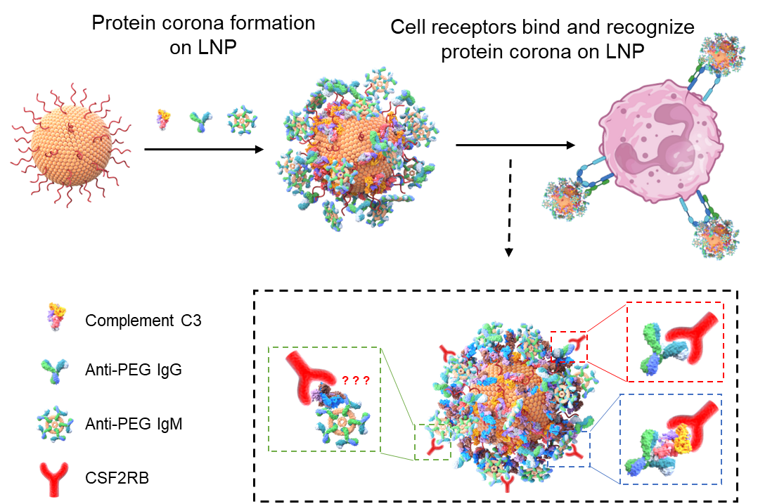图2. LNP在血液中的行为受其血浆蛋白冠的影响,并通过PEG抗体与补体等途径与髓系细胞受体识别,介导LNP胞吞。