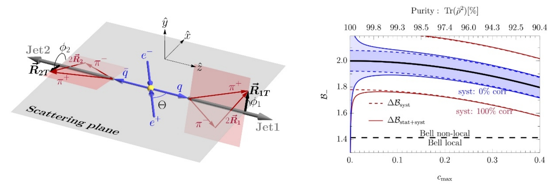 岩斌课题组独辟蹊径,通过分析Belle实验数据中强子化产物的角度分布,成功捕捉到夸克量子态的"指纹"。这些精细的角关联模式表明,产生的夸克对保持着量子纠缠行为,并显著违反了描述经典物理的贝尔不等式。这是首次在强相互作用主导的系统中利用非衰变模式发现的此类量子关联特征,为粒子物理学和量子信息科学领域之间的联系开辟了新途径,相关研究方法可以直接应用于北京谱仪III(BESIII)以及我国提出的环形正负电子对撞机CEPC等。