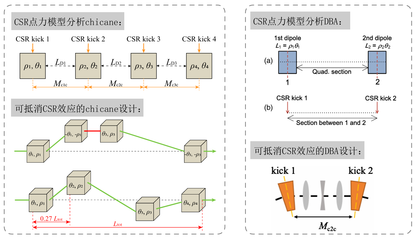 由于CSR效应机制复杂,如何有效抑制其影响是加速器领域近二十年来长久未决的国际性难题。团队负责人焦毅研究员长期致力于CSR效应的相关研究,并于2014年首次提出了用于解析分析CSR效应的“二维-点力”模型及方法 [4]。该方法将弯铁内复杂的CSR效应简化为水平二维相空间中的一个“点力”,显著简化了弯铁传输段内CSR效应的束流动力学分析,从而允许解析得到完全抵消CSR线性效应的普适性条件。据此提出的双弯铁消色散结构设计方案,其抑制效果远优于国际同行提出的其他方案。基于该模型和方法,研究团队突破传统的对称型几何设计思路,先后提出了对CSR效应“免疫”的新型束团传输段设计(包括双弯铁和三弯铁消色散结构[4,5])和新型束团压缩器设计(包括双弯铁消色散和chicane结构[1-3,6])。这些工作形成了系统的对CSR效应“免疫”的束流传输系统的理论及设计框架,为新一代光源及对撞机的电子束高品质传输设计提供了创新思路。相关模型和方法已在国际下一代大型加速器—未来环形正负电子对撞机(FCC-ee)、国际首台第四代同步辐射光源MAX IV直线加速器驱动的自由电子激光、日本KEK实验室的能量回收型直线加速器等加速器设计中被采用 [7-9]。