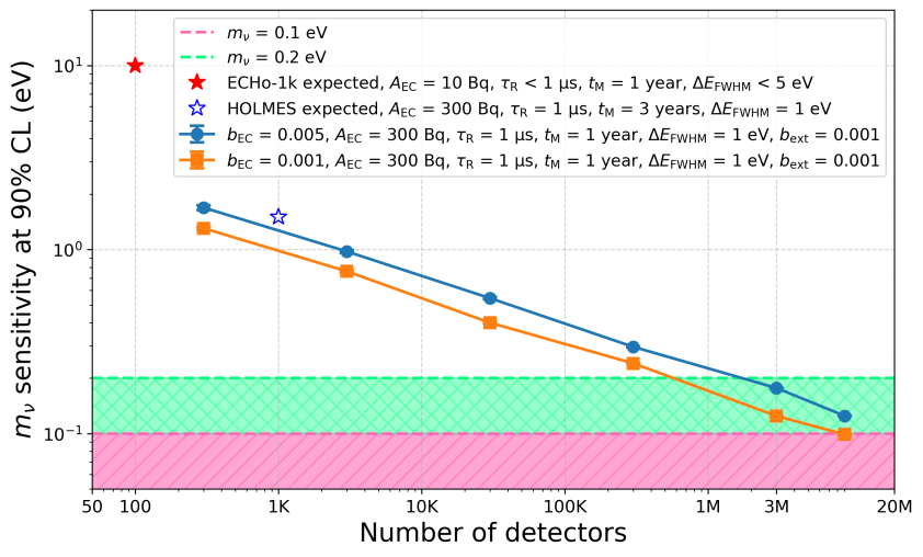 本研究聚焦于衰变能极低(仅1.18 keV)的镝-159至铽-159的轨道电子俘获过程,提出利用极优能量分辨率的超导探测器测量该过程衰变能谱(见图1)。文章通过蒙特卡洛模拟,详细分析了镝-159同位素的衰变能谱,得到了预期的中微子质量上限;并进一步计算了能谱参数误差对中微子质量测量的不确定性,分析了多种实验本底的影响,最终预期在 90% 置信水平下可实现小于 0.2 eV的电子中微子质量灵敏度(见图2)。该实验构想有望成为中微子质量测量的有力竞争者。