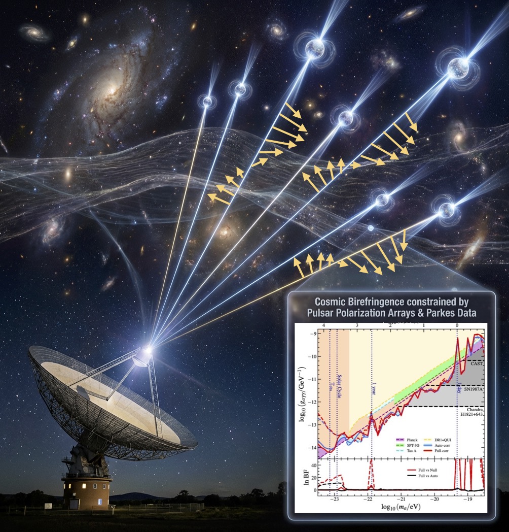 近日,快盈v3理论物理室任婧研究员及合作者联合澳大利亚帕克斯脉冲星计时阵列合作组(PPTA),成功完成利用“脉冲星偏振阵列”对超轻类轴子暗物质的首次实验探测。基于帕克斯阵列长期积累的偏振数据,研究团队在“模糊”质量区间,为超轻类轴子暗物质与电磁场的 Chern‑Simons 耦合强度设定了迄今最严格的观测上限。该成果于1月7日发表于《物理评论快报》(Phys. Rev. Lett. 136, 011001 (2026)),并获选“编辑推荐”论文。