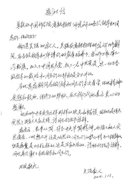 听到这些,大家无不心情沉重。吴强的父母也满含热泪地回忆起吴强的生前往事,不无伤感;但看到大家的爱心善举,感激之情溢于言表并送上吴强家人的一封感谢信,感谢在吴强患病期间各级领导和同志们给予吴强精神上的安慰和鼓励;感谢高能所同志们的爱心捐助。(后附:吴强家人的感谢信)