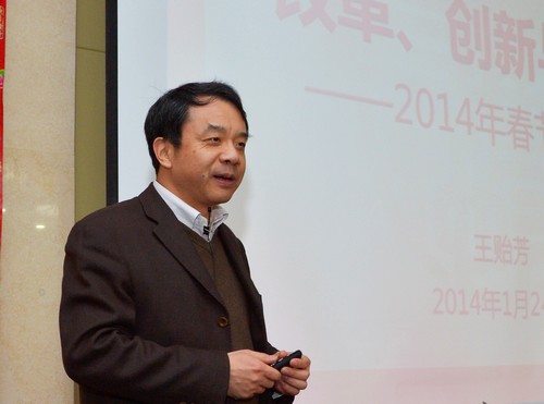 茶话会由所党委书记王焕玉主持。所长王贻芳代表所领导向一年来辛勤工作、成绩卓著的全所职工、学生,坚守在散裂中子源、大亚湾、江门中微子实验站、羊八井宇宙线观测站的工作人员以及为研究所发展作出贡献、奠定基础的离退休老同志致以诚挚的问候和新春的祝福。王贻芳表示,2013年党和国家领导人多次来所视察,对高能所取得的成绩给予了充分的关注与肯定,高能所要学习贯彻中央精神,着力于改革与创新,谋划未来发展。王贻芳从科学研究、大科学装置运行和建设、科技成果转化、创新管理等方面重点回顾了研究所2013年所取得的成绩,他表示,2013年高能所成绩卓著,各项成果振奋人心,未来五至十年,依托重大科技基础设施群、持续的科研创新能力以及良好的技术转移平台,研究所将迎来重大发展机遇,同时也面临着严峻挑战,高能所将按照习近平总书记“四个率先”的要求,以中科院“率先行动”计划为牵引,聚焦科学目标、推进人才战略、推进能力建设、规范管理方式,通过改革与创新,向着成为国际领先的高能物理研究中心、大型综合性科学研究基地的战略目标迈进。