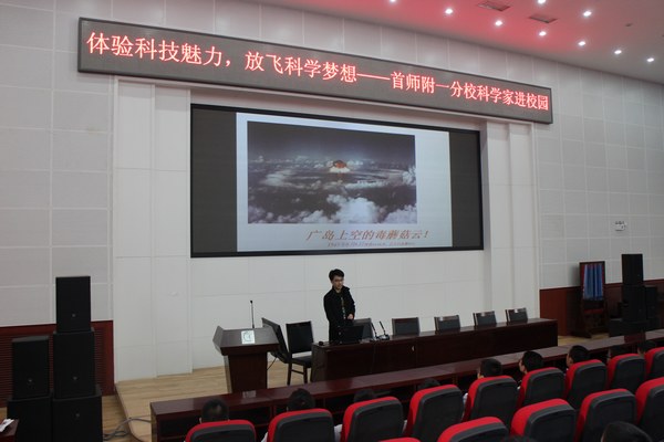 11月13日下午,加速器中心团支部一行四人应邀来到位于海淀区的首都师范大学附属中学第一分校,为该校初二年级学生做了一场生动有趣的科普讲座,拉开了首师附一“体验科技魅力,放飞科学梦想——首师附一分校科学家进校园”活动的序幕。