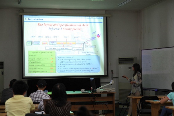张源作了《Application of Differential Evolution Algorithm in Future Circular Colliders》报告。内容涉及在KEKB和CEPC的lattice设计中优化束流孔径时所用到的优化算法,着重解释了多目标遗传算法,并给与会人员介绍了在IPAC2016会议上与该领域同仁的交流情况,解答了关于优化算法初值和遗传算法进化速度的提问。闫芳的报告:《Commissioning of the China ADS Injector-I testing facility》则主要介绍了ADS注入器I从2014年5月至今不同阶段加速器的安装调试过程、各阶段所取得的成果和目前所遇到的问题等情况。整个报告进行中,现场提问与讨论环节气氛热烈而活跃。