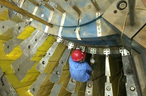 图为上间隔屏蔽体与密封桶间的填塞钢板操作