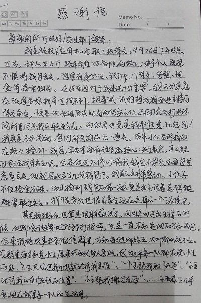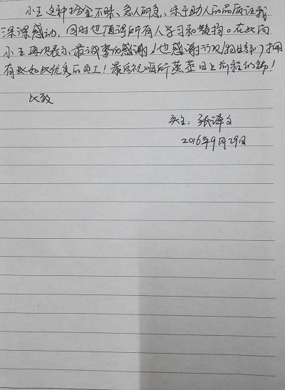 9月26日下午,中科院高能所科住物业主楼保安值班人员王巨宝同志拾到核技术应用研究中心职工张译文的钱包,并立即上报到行政处联系失主,随后巧遇张译文,经核对后返还失主。失主深表谢意且送来感谢信。王巨宝同志拾金不昧的雷锋精神值得全所职工学习和发扬。