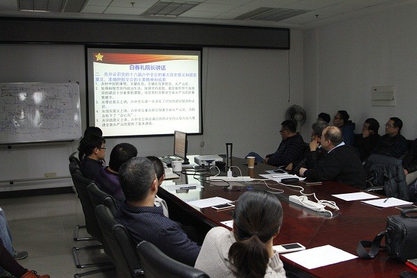 史戎坚首先传达了所党委部署的《中共中国科学院党组关于认真学习宣传贯彻党的十八届六中全会精神的通知》,以及中科院党组书记、院长白春礼和党组副书记、副院长刘伟平在中科院学习宣传贯彻党的十八届六中全会精神工作部署会上的重要讲话精神,明确了本次会议的重点学习内容,包括十八届六中全会公报,以及《关于新形势下党内政治生活的若干准则》和《中国共产党党内监督条例》。