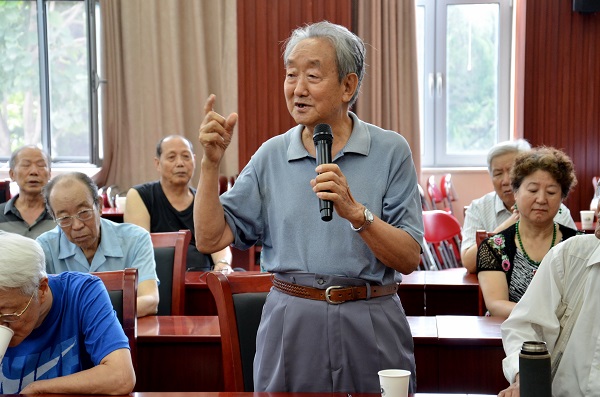 本次活动是总支为纪念建军九十周年面向高能所离退休复转老军人专门举办,其中有9位是80岁以上的高龄老人。座谈会开始前,全体到会的复转军人集合起立,面向军旗庄重敬礼、高唱中国人民解放军军歌,在嘹亮的军歌声中,老兵们仿佛又回到了当年那段激情燃烧的岁月。