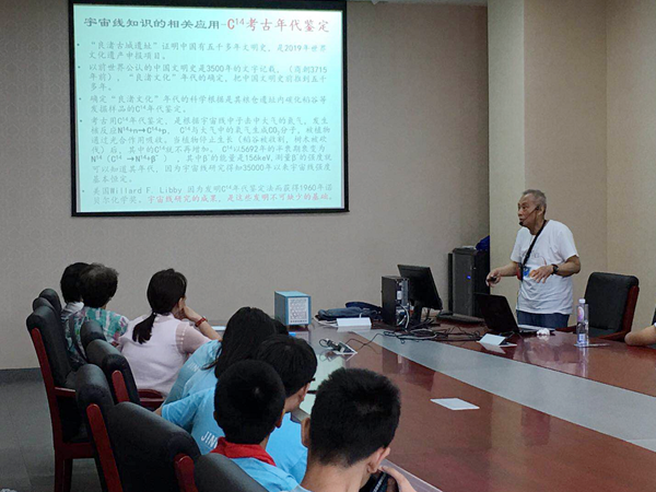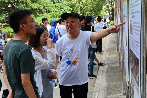 高能所老科协制作了主题展板——“追寻高能物理研究所的发展足迹”,并组织了资深老科技工作者们进行现场讲解。老科学家们不顾天气的炎热,积极热情地为每一位驻足观看展板的参观者进行讲解,吸引了越来越多的年轻人前来观看。参观者们踊跃提问,现场人头攒动、十分热烈。高能所老科协成员沈长铨协助东直门中学铺设了宇宙射线探测阵列,建立了宇宙线实验室。在本次公众科学日活动中,沈长铨受邀向参观者讲解和演示“宇宙线扫描仪”,生动形象地展示了宇宙线就在身边,引发了公众的极大兴趣。