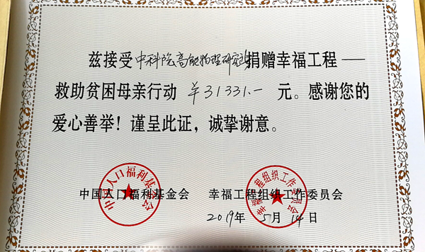 根据中央国家机关人口和计划生育委员会办公室下发的《关于开展2019年“幸福工程—救助贫困母亲行动”捐款活动的通知》(国机计生办〔2019〕1号)精神和中科院人口计生办公室的统一部署,高能所于近期组织开展了“幸福工程——救助贫困母亲行动”捐款活动。