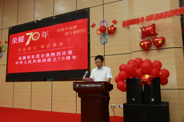 高能所副所长、东莞分部主任、党总支书记陈延伟致辞。新中国在中国共产党的伟大领导下,在中国人民的艰苦奋斗下,已经走过了70年的光辉历程,特别是改革开放以来,党和国家的事业取得了全方位、开创性的历史成就,为古老的神州大地带来了深层次、根本性的历史变革,中华民族正处在一个前所未有、世界瞩目的崭新时代。中国共产党人时刻牢记初心、使命,为中国人民谋幸福,为中华民族谋复兴,这也是激励我们中国共产党人不断前进的根本动力。今年也是中国科学院建院70周年,作为科研工作者,我们要继续坚守科技报国、创新为民的初心,牢记建设创新型国家和世界科技强国的时代使命,坚定不移地用习近平新时代中国特色社会主义思想武装头脑、指导实践,心往一处想、劲往一处使,用科技服务人民、振兴国家。