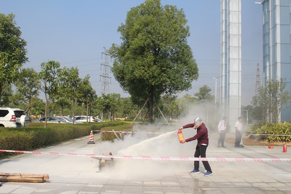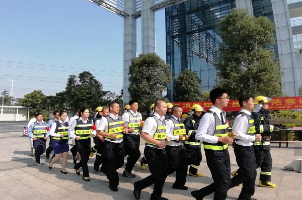 上午10:30左右,消防演习开始。伴随着急促的消防警铃声,正在办公的职工和学生立即停止手上的工作,听从现场消防人员指挥,快速通过安全通道(过道、楼梯)有序下楼,按照现场秩序疏散至A1广场。园区物业志愿消防队带着装备迅速进入到模拟着火点进行扑救,模拟过程中也对火灾进行预警升级,最后联动119消防队进行喷洒灭火演示。
