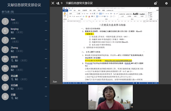 327日,中科院高能所文献信息部党支部通过网络会议的方式组织召开了全体党员大会,在线开展组织生活。本次会议主要讨论通过了本年度支部的主要工作计划,并组织学习了党的相关条例和抗疫期间习近平总书记的重要讲话精神等。