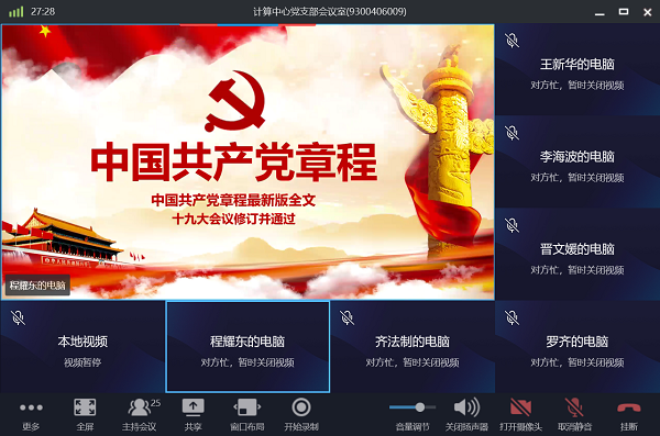 为了积极响应中科院和所党委号召,619日,中科院高能所计算中心党支部以在线视频会议的形式举行了基层组织建设年主题党日学习暨优秀党员评选活动。会议由支部书记程耀东主持,三个党小组及青年理论学习小组成员共计25人参加。