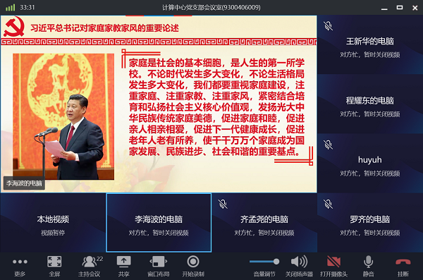 为庆祝中国共产党成立99周年,深入学习贯彻习近平总书记在中央和国家机关党的建设工作会议上的重要讲话精神,7月16日下午,中科院高能所计算中心党支部开展了“不忘初心,弘扬优良家风”主题党日活动,党支部全体成员及理论学习小组共计22人参加。