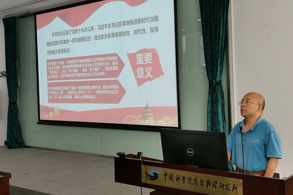 本次党课学习内容为《习近平谈治国理政》第三卷。本书内容非常丰富,王九庆老师主要选取了几篇与每位党员都息息相关的文章与支部成员共勉,包括《努力成为世界主要科学中心和创新高地》、《带头做到“两个维护”,着力推进中央和国家机关党的政治建设》、《广大干部特别是年轻干部要做到信念坚、政治强、本领高、作风硬》以及《一以贯之全面从严治党,强化对权力运行的制约和监督》。此外,王九庆还结合高能所科研工作的特点和目前运行、在建、在研的大科学工程,包括BEPCIIHEPSLHAASOCEPC等的工程进展,鼓励广大党员对技术进行深度研究,力求创新,进一步要求党员对党忠诚,不忘初心。