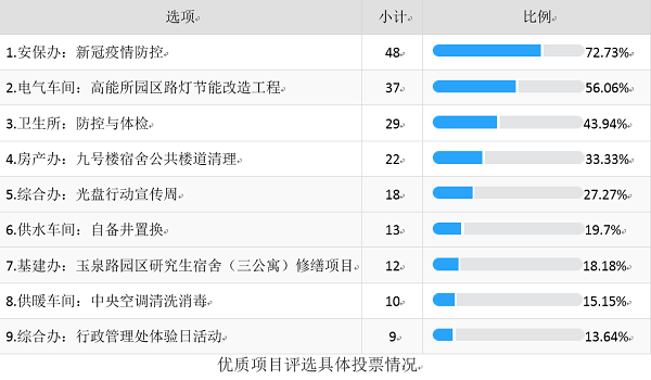 通过对2020年在建设、管理、服务和保障等方面的工作进行梳理和筛选,行政处遴选出9项项目邀请全所职工、学生在行政处公众号进行投票评选,参评项目是全处2020年提升服务水平、优化管理体系的亮点和缩影。最终,本次优质项目评选前五名分别为新冠疫情防控(安保办)、高能所园区路灯节能改造工程(电气车间)、防疫与体检(卫生所)、九号楼宿舍公共楼道清理(房产办)、光盘行动宣传周(综合办)。