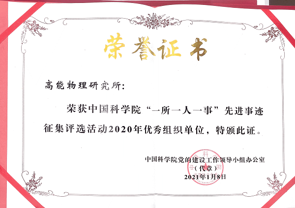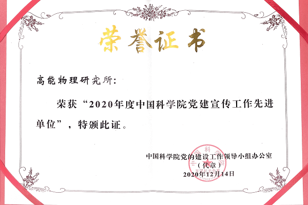 近日,中国科学院党的建设工作领导小组办公室颁发了“2020年度中国科学院党建宣传工作先进单位”荣誉证书,通报了2020年度党建宣传统计综合得分情况,并对排名前20的单位(不含分院)进行了表彰。高能所以中科院第12名、北京分院第3名的成绩获得了“2020年度中国科学院党建宣传工作先进单位”称号。
