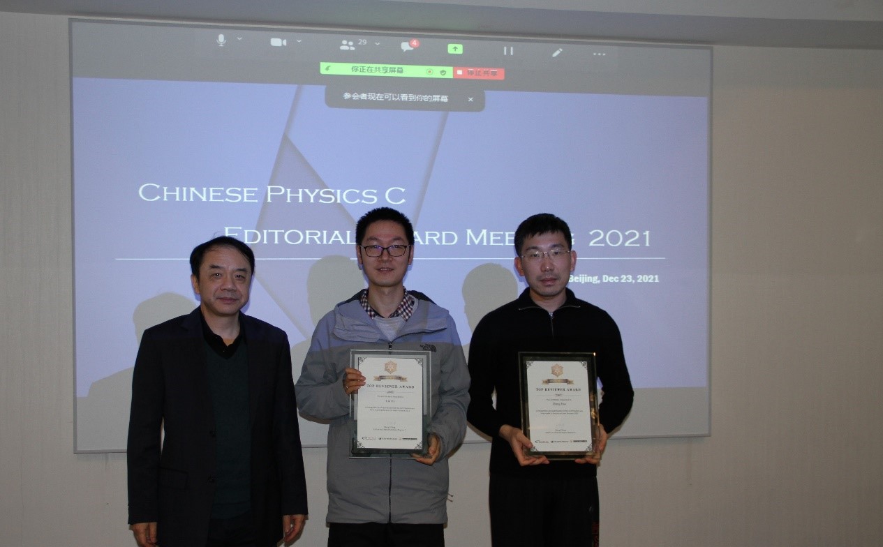 按照会议议程,主编王贻芳向2021年度优秀审稿人代表北京大学刘佳教授、高能所张昊研究员颁发了荣誉证书,以感谢他们为《中国物理C》审稿工作做出的贡献。