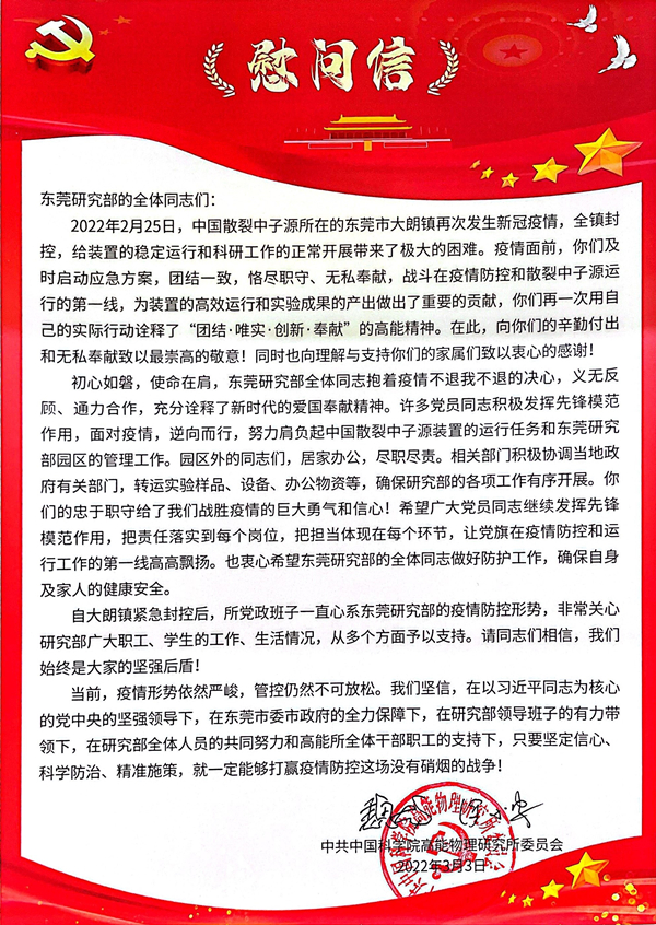 高能所党委给积极“战疫”的东莞研究部发来慰问信