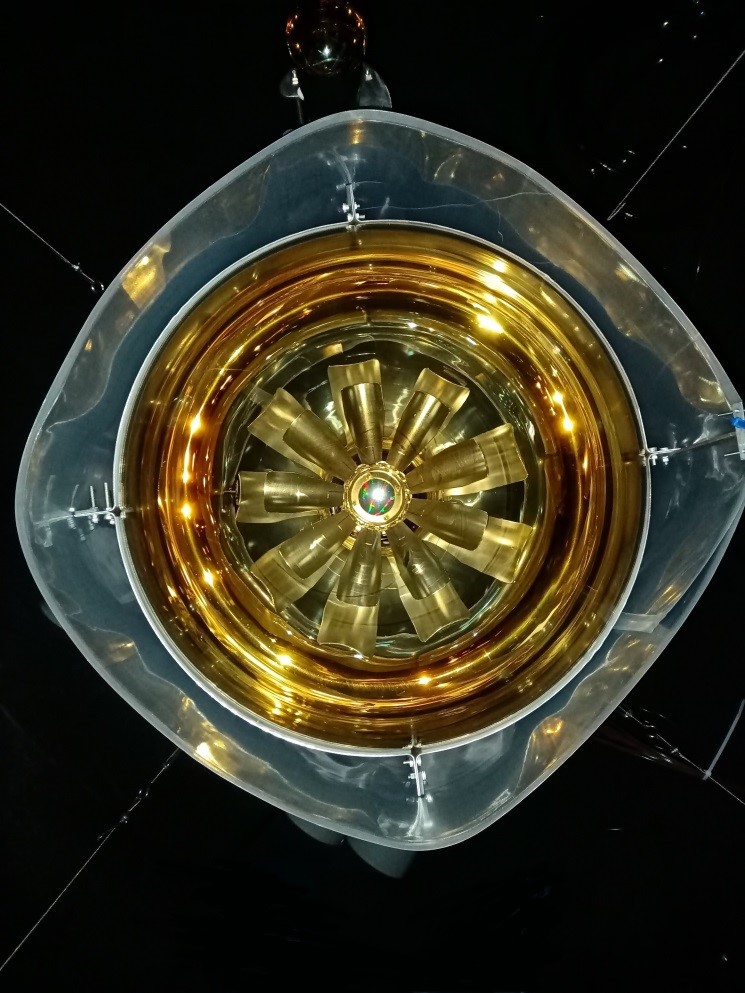 粒子天体物理中心的高博、游晓浩作品“高原之眼”斩获本次图片大赛的一等奖,该作品展示了高海拔宇宙线观测站水切伦科夫探测器中使用的20英寸国产微通道板型光电倍增管加装磁屏蔽之后的俯视图,光电倍增管在海拔4410米的海子山等待宇宙线的到来,就像一只眼睛,默默地注视着浩瀚星空,探寻宇宙线的源点。