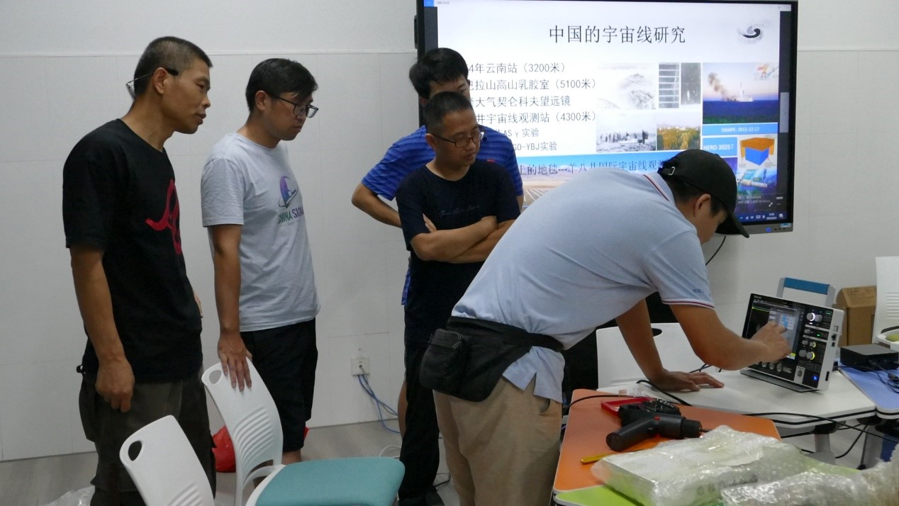 校园宇宙线观测联盟技术组主要力量来自LHAASO探测器组志愿者团队,包括科研人员、技术人员、博士后和研究生。志愿者们在出色地完成本职繁重的科研任务的同时,根据中学科学教育的特点和要求,设计、研制了校园宇宙线探测阵列和缪子望远镜等观测设备;完成了“重走宇宙线发现之旅”实验课程编制,并在2022年7月23-24日的校园宇宙线观测暑期学校进行了全面的教学,受到与会师生的赞誉。这次,他们又在周末冒着酷暑,完成了姜堰中学宇宙线观测装置的安装和调试,实现了正常运行并开始获取观测数据。
