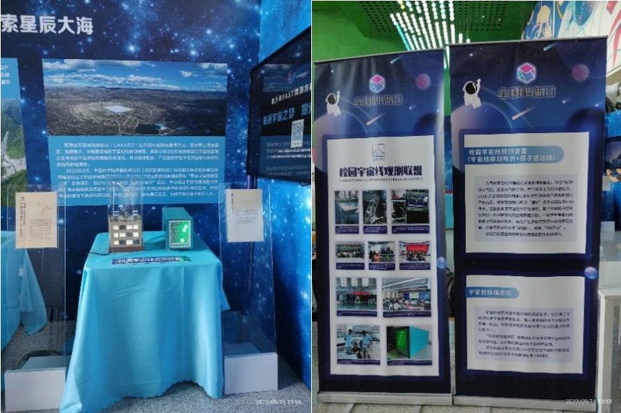 2022年9月,校园宇宙线观测联盟受邀参加了在中国科技馆举办的全国科普日北京主场活动。联盟精心组织,制作了“校园宇宙线观测站“模型,提供了宇宙射线描迹仪进行展出,还提供了联盟活动及展品介绍,包括老一辈科学家、中青年核心骨干到年轻学生在内的联盟志愿者提供了优质的志愿服务。展品放置在“追逐宇宙之梦 探索星辰大海“展区,作为国家重大科技基础设施高海拔宇宙线观测站(LHAASO, 中文简称拉索)外展科普的示范,引得媒体以及大众的广泛关注和驻足,获新华社、经济日报、中国经济网、CHINADAILY等媒体报道。