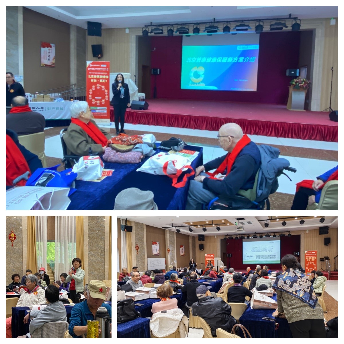 重阳祝福之后,离退办邀请了“北京普惠健康保”(简称“普惠保”)代理人——中国人寿财险的2位工作人员为大家讲解“普惠保”相关知识条款,并现场发放宣传手册。