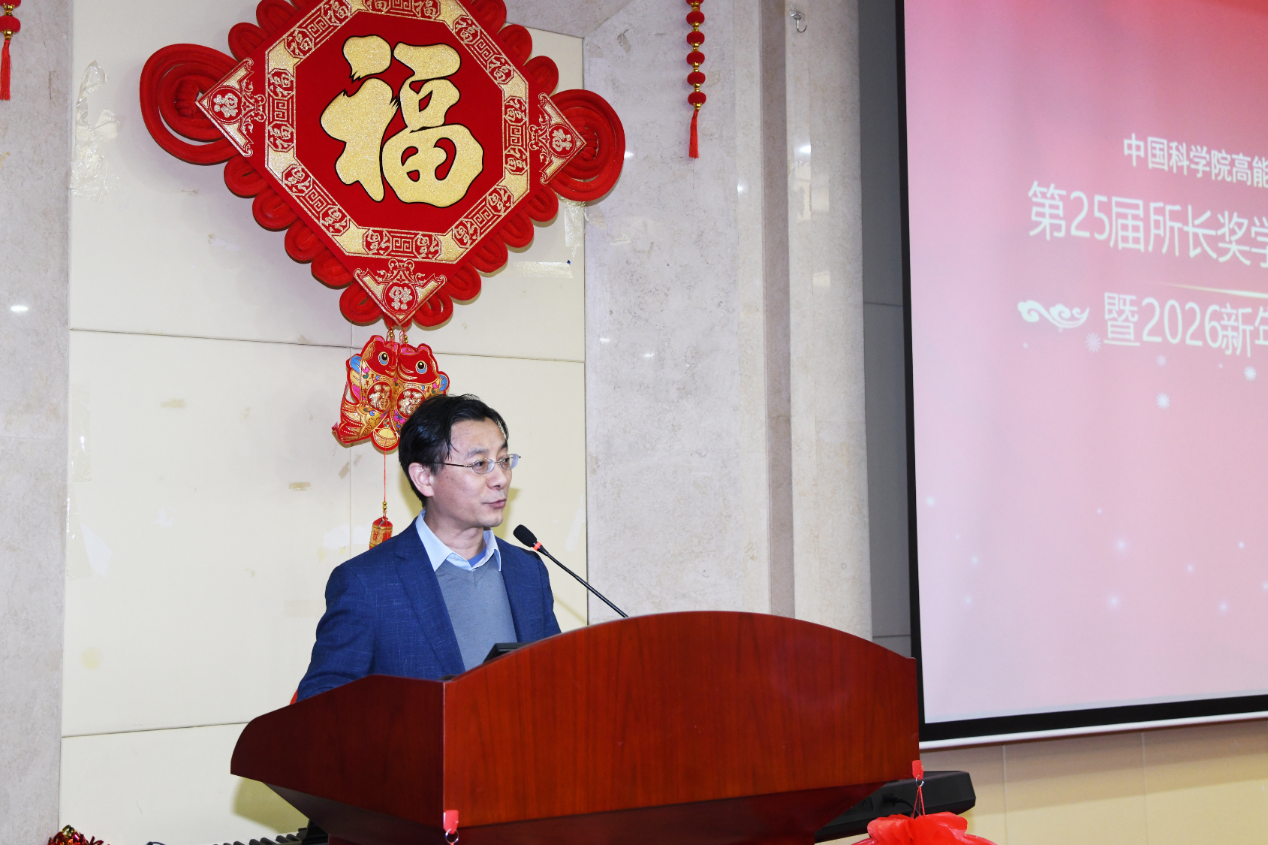 曹俊致辞,他首先向所有获奖同学表示祝贺,并指出这份荣誉是对过往成绩的肯定与未来科研的激励。他强调,2025年是高能所发展进程中意义非凡的一年,研究所紧密围绕国家及中国科学院战略部署,持续优化学科布局,前瞻布局人工智能等新兴交叉领域,深化国际合作与人才培育机制,为青年人才的脱颖而出营造了优良环境。他简要回顾了过去一年研究所在科研创新等方面取得的突破性进展,勉励青年学子勇担使命,充分依托研究所一流的科研平台与资源,践行“团结、唯实、创新、奉献”的所训,脚踏实地,勇攀高峰,为高水平科技自立自强贡献青春力量,并致以新年祝福。