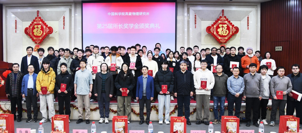 随后,刘聪展宣读第二十五届所长奖学金获奖学生名单。获奖学生代表黄吉鸿发言,他感谢导师的悉心指导、研究所提供的科研平台及保障与支持。他表示将铭记高能所人责任,不懈努力、勇于创造。在热烈的掌声中,所领导为获奖学生一一颁发荣誉证书,并合影留念。