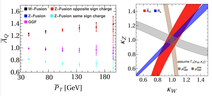 图:电荷不对称性随喷注平均横动量分布(左图)以及通过电荷不对称性限制希格斯和规范玻色子相互作用大小(右图)