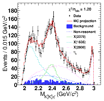 图2: J/ψ→γKS0KS0η' 过程观测到的KS0KS0η' 不变质量谱及其拟合结果。