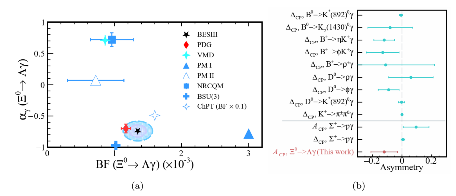 图:(aBESIII 实验对Ξ0→Λγ过程衰变不对称参数及分支比的测量结果与各理论预言的对比。(b)介子和重子弱辐射衰变中 CP 不对称性测量结果的总结。