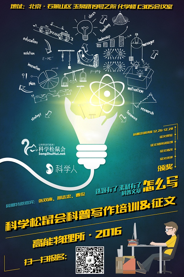 奖励机制:培训讲座后,每位参赛人员有四周时间完成一篇科普文章,经过初选后,入围作品将受到专业科普作家一对一指导。润色完成后的作品进入决赛,并最终选出20名获奖作品。除去丰厚的奖励外,获奖人员还有可能成为高能所微信公众号的特约写手。