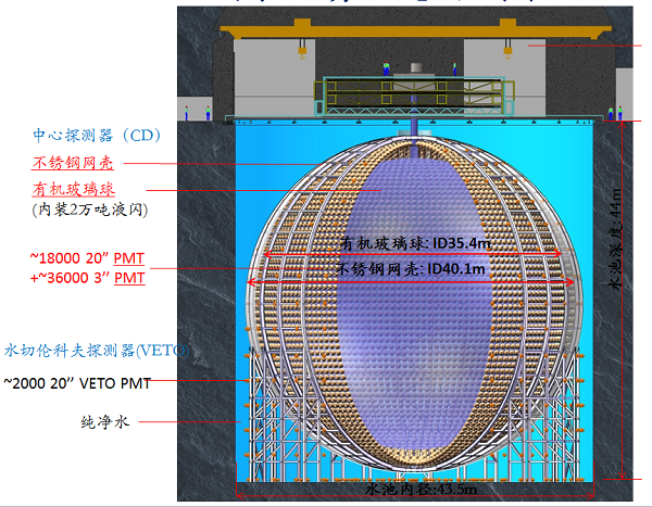 中心探测器结构示意图如图1所示,其整体形状为球形,置于直径约为43.5m,深44m的水池中。中心探测器主体结构分内层结构和外层结构,其中内层结构为直径(内径)35.4m的有机玻璃球壳,该球壳通过一定数量的支撑杆连接在外层不锈钢球面网壳上,钢网壳内径为40.1米,外直径为41.1米。有机玻璃球内装有2万吨液体闪烁体(下文简称为液闪),液闪密度为860kg/m3,其主要成分为烷基苯。不锈钢网壳的内表面安装有约18000只20英寸的和25000只3英寸的朝内的光电倍增管(下文简称PMT),以探测中微子;在中心探测器不锈钢网壳的外表面还安装有约2400只20英寸的朝外的PMT,这些PMT用以探测宇宙线产生的切伦科夫光满足反符合探测器(下文简称VETO)的探测需求。在有机玻璃球和不锈钢网壳之间以及不锈钢网壳和水池池壁之间,均有超纯水,它既作为屏蔽液体,也是反符合探测器的介质。中心探测器整体结构通过一定数量的立柱固定于水池底部。
