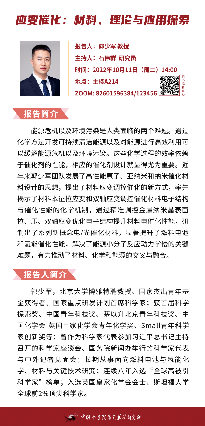 【10.11】建所50周年系列活动之高能所科技创新论坛(358)应变催化:材料、理论与应用探索