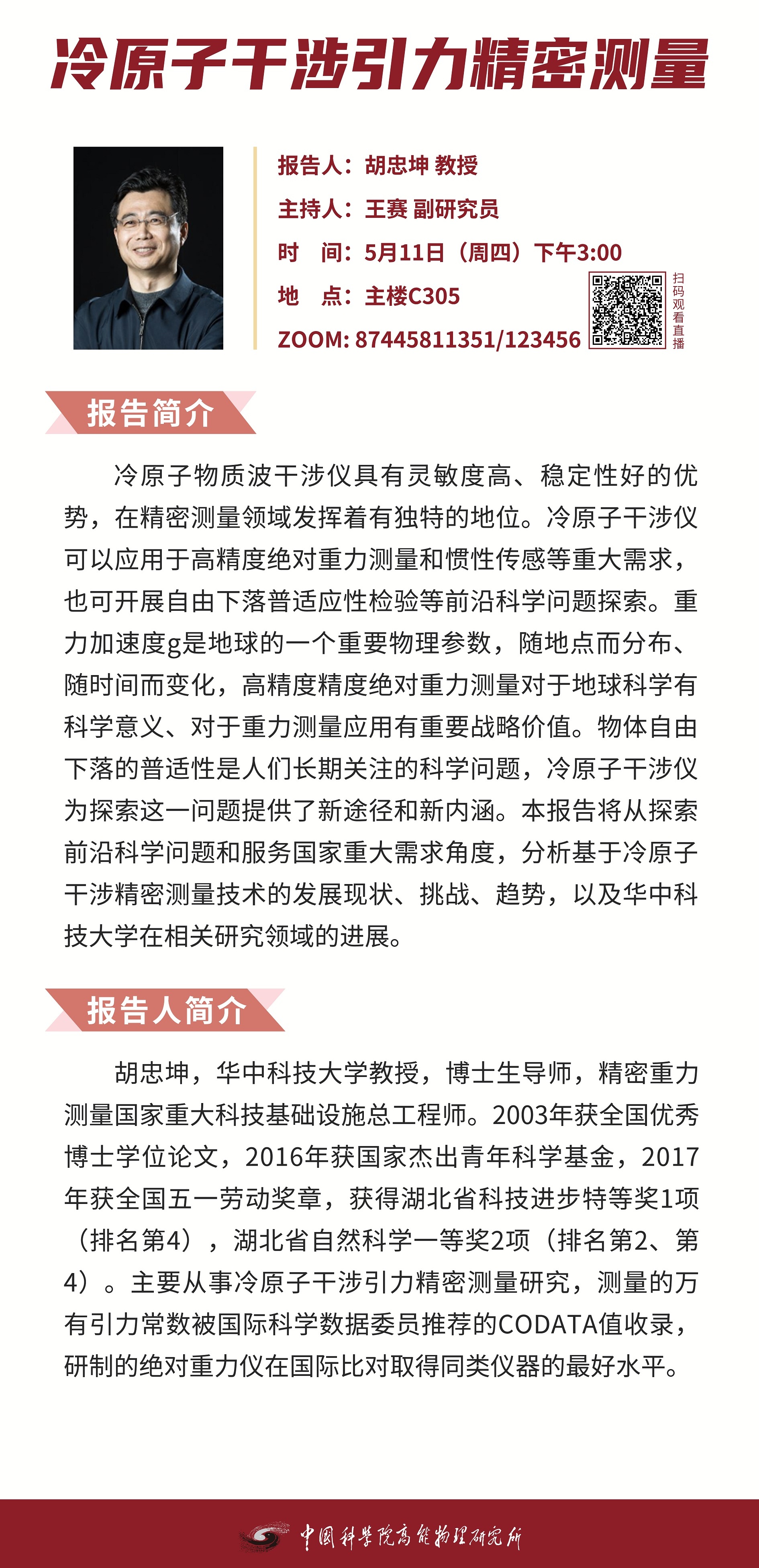 【05.11】建所50周年系列活动之高能所科技创新论坛(370)冷原子干涉引力精密测量
