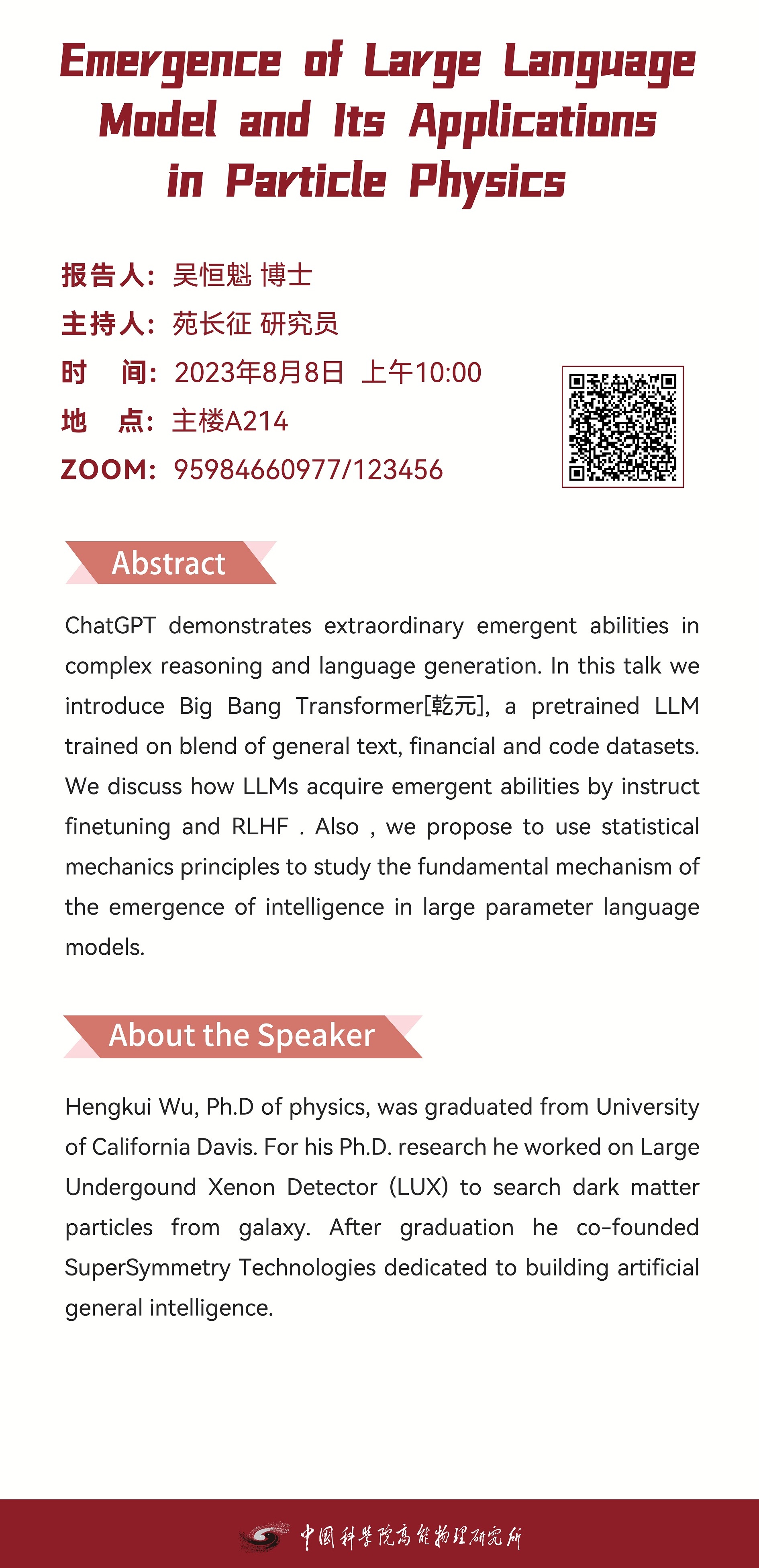 【08.08】建所50周年系列活动之高能所科技创新论坛(376)Emergence of Large Language Model and Its Applications in Particle Physics
