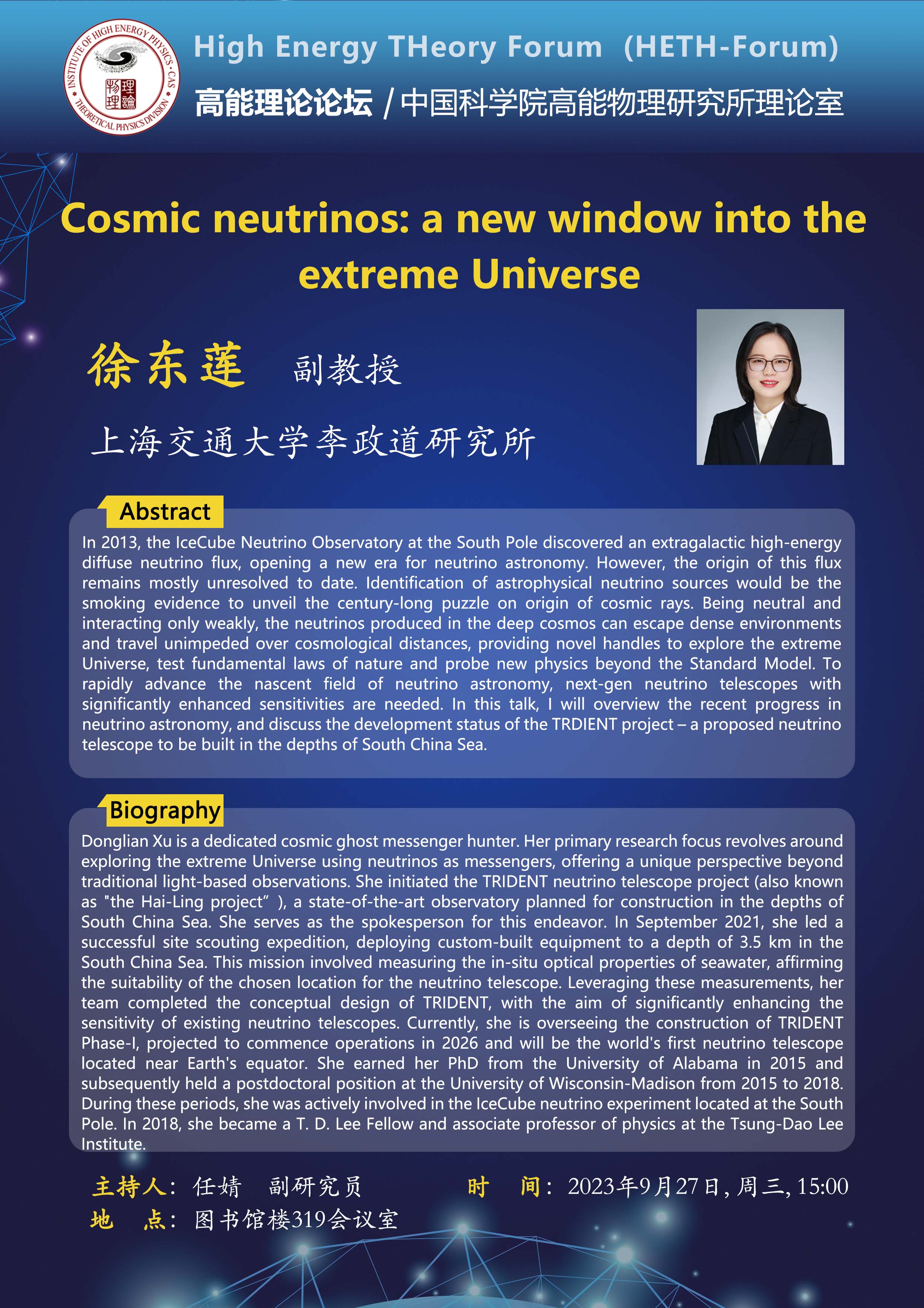 【09.27】高能理论论坛第54期--Cosmic neutrinos: a new window into the extreme Universe